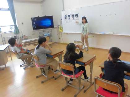 栄養教諭の田和先生に,かむことの大切さについて教えてもらいました。