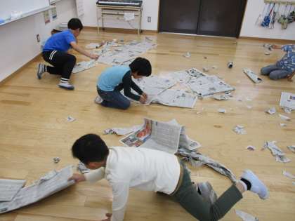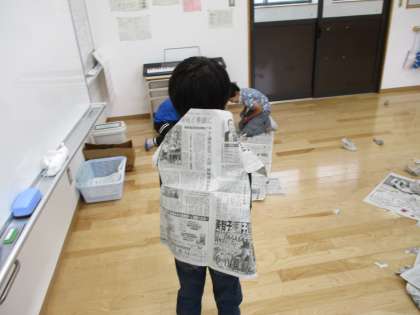 新聞紙を丸めたり,着たり,破ったりして全身で表現しました。