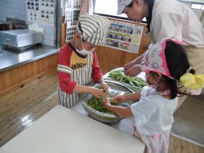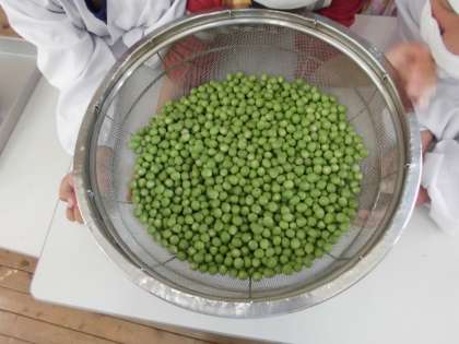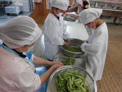 ほおばに包む豆ごはんに入れるエンドウ豆の皮むきをしました。豆が大きくて,皮が固くむきにくかったですが,無言で一生懸命にむいていました。明日の給食が楽しみです。