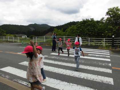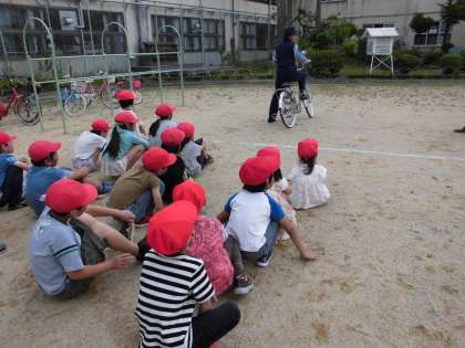 警察の方に自転車の正しい乗り方と横断歩道の渡り方を教えていただきました。お話の後,実際に自転車に乗ったり,学校下の横断歩道を渡ったりしました。