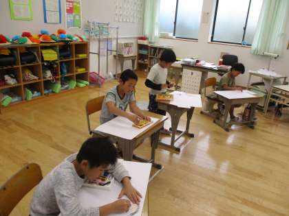 かばくんのお尻が狙われてしまう「おしりどろぼう」,百円玉の「ひゃっくん」などをお話から想像ながら筆をはしらせました。
