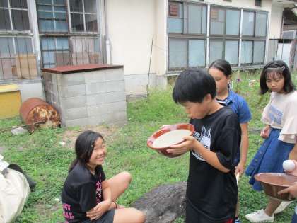 すり鉢にもみを1握り入れ,軟式野球ボールですってもみすりをしました。子どもたちはとても楽しそうにもみがらを吹き飛ばしていました。