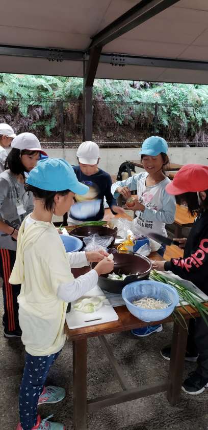 今日のメインの活動は野外炊事です。班で協力して,すき焼き風煮を作ります。調理係とかまど係に分かれて,声を掛け合いながら,作業を進めています。