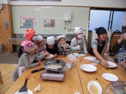 2年生と一緒に,畑でとれたとうもろこしでポップコーンを作りました。蓋をすると,ポンポンと音がしてはじいていきました。みんな「手がとまらへん。」と言いながら,パクパク食べていました。