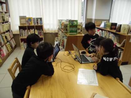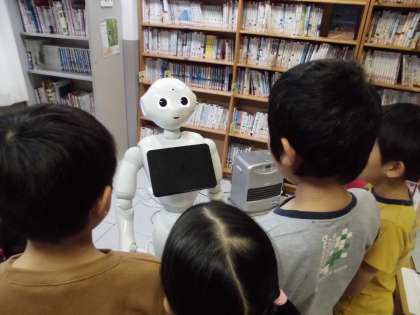 2年生がペッパーくんとじゃんけんをしたり,動かしたりする学習をしました。1年生も一緒に見たり聞いたり遊んだりさせてもらいました。仲良くプログラミングをしたり,楽しく触れ合ったりしていました。