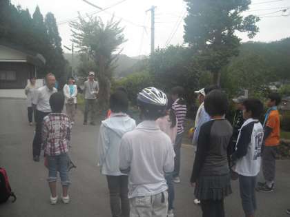 出発式の様子です。台風の影響で天気が心配でしたが、出発当日は、くもりで涼しくて快適でした。