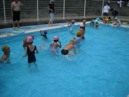 お母さんたちが,そうめんをゆでている間はとなりにあるプールに入りました。プールでは、宝さがしもしました。