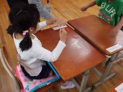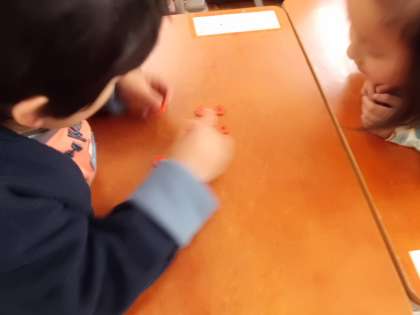 二人で同時にサイコロをふって7になるか考えたり,おはじきを使っていくつといくつで8になるかを考えたりしています。
