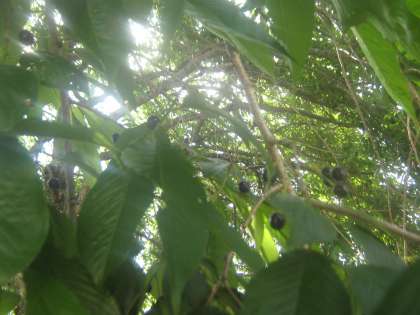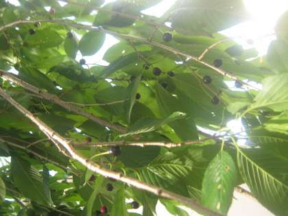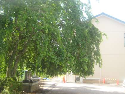 正門前の「枝垂桜」葉も実もおいしげっています。