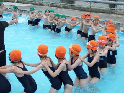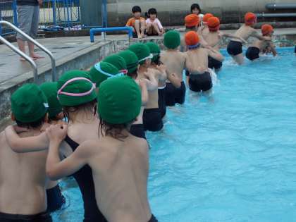 先日からプールの学習が始まりました。2年生と一緒に,お風呂屋さんごっこをしたり,カニさんになったりして水慣れをしています。1列の長い列車になって,プールをくるくる回りました。前の友達と離れないように,みんな一生懸命です♪