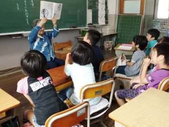 京北お話の会より,読聞かせに来ていただきました。きょうのお話は「ピカソの絵本〜あっちむいてホイッ」でした。