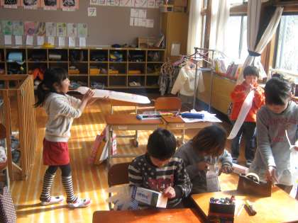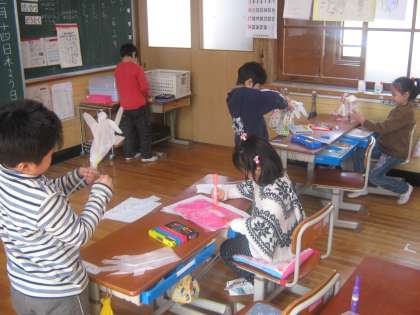 息を吹き込むと箱の中から ニョキニョキ飛び出す楽しい工作〈1年生)。仕掛けや飾りを工夫して作っています。