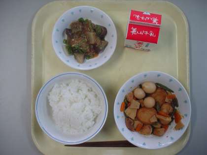 今日の献立は,ごはん,牛乳,平天の煮つけ,京野菜のごまみそかけ です。