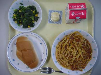 今日の献立は,バターテーブルロール,牛乳,スパゲティのミートソース煮,ほうれん草のソティ,チーズ です。