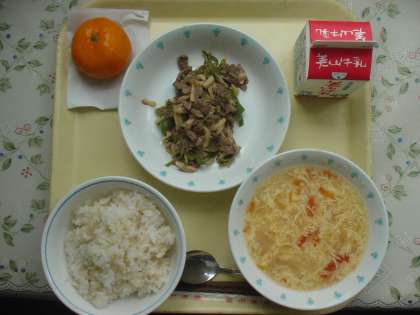 今日の献立は, 玄米ごはん,牛乳,青椒肉絲(チンジャオロースー),トマトと卵のスープ,みかん です。