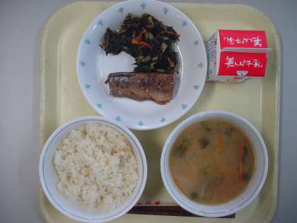 今日の献立は,京北地域のみの京北献立です。麦ごはん,牛乳,さんまのしょうが煮,小松菜とひじきのいためもの,いものこ汁 です。