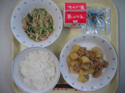 今日の献立は,ごはん(京北産米),牛乳,肉じゃが(カレー味),小松菜と切干大根の煮びたし,じゃこ です。