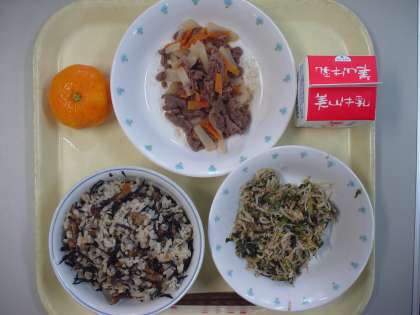 今日の献立は,京北地域独自メニューになっています。ひじきごはん,牛乳,牛肉の甘辛煮,もやしのごまいため,みかん です。