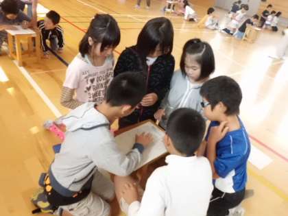 10月7日(火)なかよしタイムの時間に全校で「算数あそび」を行いました。4年生はわり算の「たてるかけるひくおろすゲーム」をしました。色の5・6人で順番に問題を解いていきます。協力して5分間に何問できるかを競いました。あせったけれどやっていくうちに楽しくなってきた。疲れた。という子ども達の感想でした。