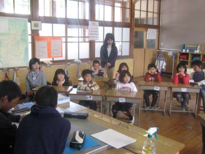 ・今日の4校時,四色に分かれての縦割り班会で1年生歓迎遠足に何処に行くのか話し合ったりした後校庭でお花見をしました。