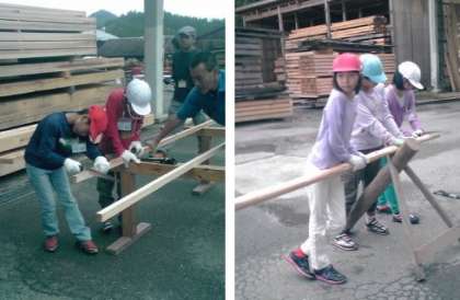 製材の様子を見学した後,角材や垂木をのこぎりを用いて切断する体験をさせてもらっています。