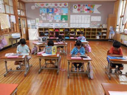 毎週木曜日は,全校一斉に朝読書をしています。1年生もひらがなを習ったので,本をどんどん読んでいます。100冊めざして!!