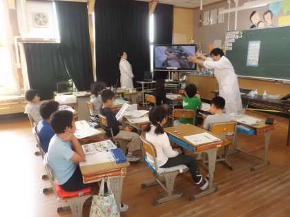 10月23日(金)の3,4校時に右京保健センターから2人きていただき、食中毒のお話や手洗いセンサーを使った実習を行いました。子どもたちは、食中毒のこわさに真剣に耳を傾けていました。また、実習では、水で手を洗ったときや洗剤で洗ったときの様子を手洗いセンサーで調べました。一度では、なかなか雑菌が落ちず、何度も洗いなおしていました。目で見てたしかめることが出来るので、子どもたちにとって衝撃的だったようです。これからも、家でも学校でも手洗い、うがいをしっかりしていきましょう。