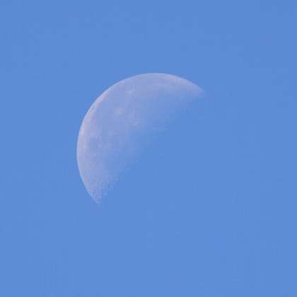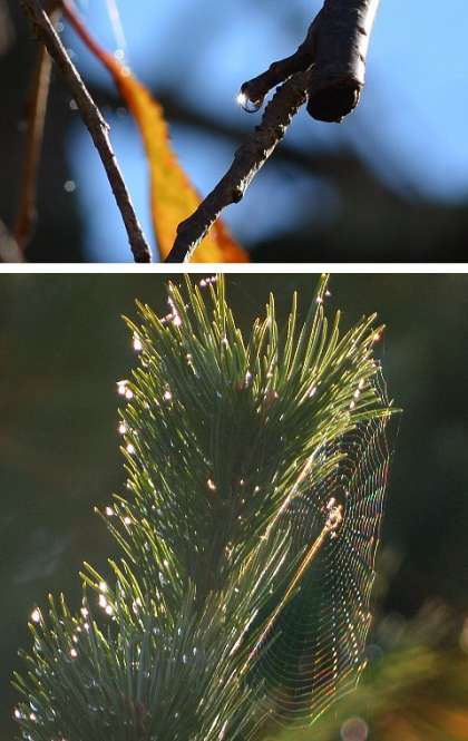 霧が晴れた午前,上の方からキラキラ輝くものが目に飛び込んできました。見上げると,陽射しを受けた木々の露(水滴)でした。さらに,秋らしい澄み切った青空を見回すと下弦を過ぎた月が,ここにいますよと目に映り込んできました。