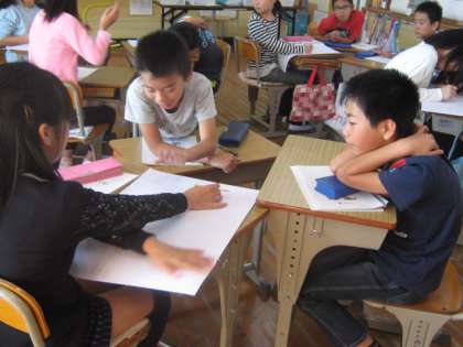 今日は,「お米の苗作りからごはんを食べるまでに,どんな仕事のつながりがあるのか」を話し合いながら,画用紙に書き上げてみました。
