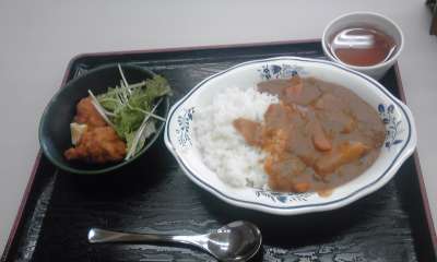 伐採体験の後,あうる京北に戻って昼食です。子ども達の大好きなカレーライスと唐揚げです。
