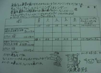運動会の練習が続きますね。からだの柔軟性やバランス能力の低下を防ぎ、ケガに気を付けましょう。ちょこトレを毎日続けることで、筋肉をきたえることができます。児童保健委員会で、ちょこトレカレンダーを作りました。今回は、片足立ちとスクワットです。教室で、ちょこトレをやってみてください。カレンダーを出す日(9月22日)に、○がたくさんあるといいですね。ちょこトレカレンダーを出した人に、がんばったね!スタンプを押して、返します!ちょこトレカレンダーが終わっても、お家でちょこトレを続けてくださいね。(けが等その他の理由でトレーニングができない人はやらないでくださいね。)
