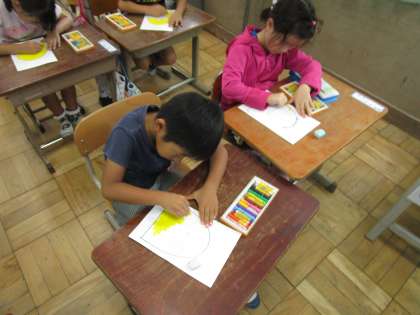 今日は,障害物競走で被るミニオンのお面を作りました。