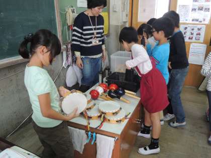 子どもたちは,楽器の材質だけでなく,同じ楽器でも大きさによって音が違うことに気づき,楽器を選んでいました。