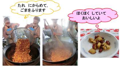 打ち豆・ミックスビーンズ・さつまいもを油で揚げ,甘辛いたれをからめてつくりました。