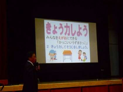 校長先生から,今月の「えがおのもと」の話がありました。今月は『協力しよう』をみんなで頑張ろうという内容でした。