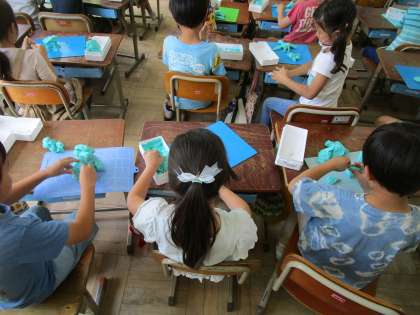 図画工作科で「にぎにぎねん土」という学習をしました。2年生では初めて粘土に触れました。握った形から想像力を働かせて,様々な作品を作ることができました。