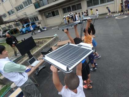 ソーラーパネルで発電をしました。太陽がある方向へ向けると発電量があがり,ソーラーパネルは方角と角度が大切だということが分かりました。
