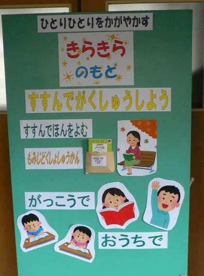 12日(金)に朝会があり,今月のきらきらのもと「すすんでがくしゅうしよう」について話をしました。15日(月)からはもみじ読書週間が始まります。すすんで本を読むことはもちろん,学校やおうちでは大人に言われる前に自分からすすんで学習しましょう。と話をしました。