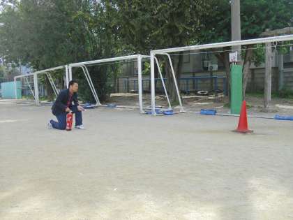 避難後は消防士さんのお話を聞き,万が一の場合には実際に消火する立場にある我々教員が,消火器の取り扱いを学びました。