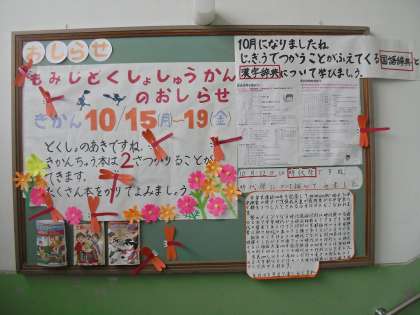 本日から「もみじ読書週間」が始まりました。19日までの取り組みになりますが,この期間には本を2冊借りることができます。秋の夜長に,読書もいいですね。