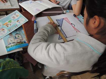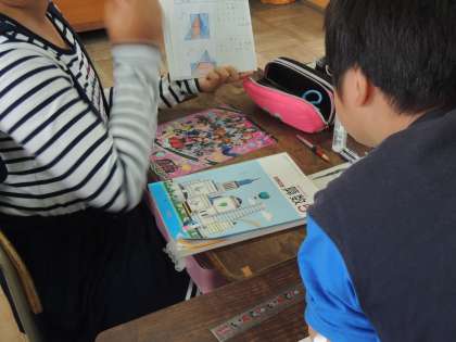 子どもたちそれぞれで,考えた面積の求め方を話し合っています。
