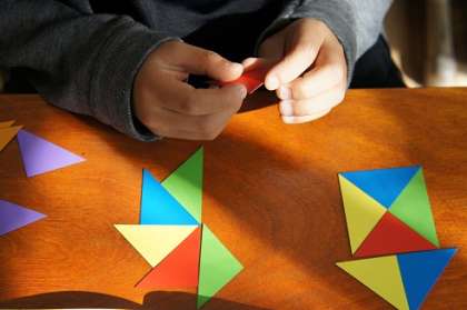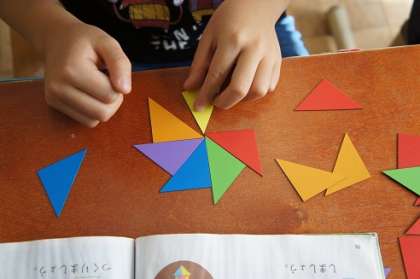 算数科では,「かたちづくり」の学習が始まっています。この日は,三角形を並べて,いろいろな形づくりにチャレンジしました。