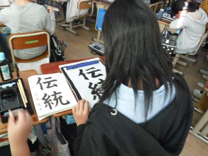 今日は毛筆書写で「伝統」と書きました。