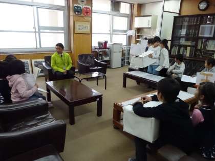 総合的な学習の時間で学習している「太秦のすてき」で,太秦小学校をよくするためにポスターや看板を作りました。それを学校に掲示するために,校長先生にお話を聞いていただきました。みんな緊張した様子でしたが,どういう思いで作ったのか,自分たちの言葉で話せていました!