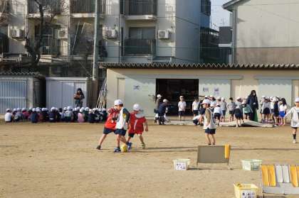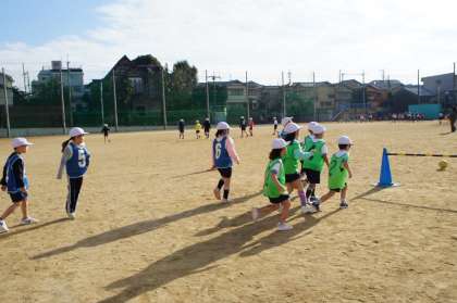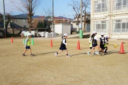 1年生は,体育の学習でボールけりゲームをしています。仲間にパスをしていきながら,ゴールを目指して走っています。作戦タイムでは,どのように動けばもっとゴールを決めることができるのかを考えています。日に日に寒さが増していますが,一生懸命にボールを追いかけているうちに,体がどんどんぽかぽかしていきます。