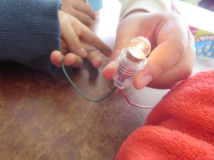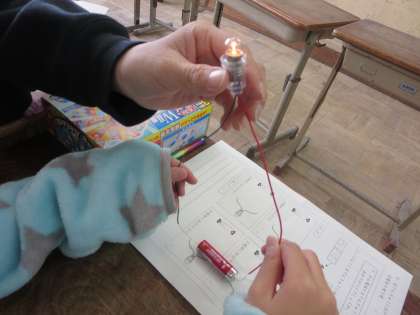 理科で学習で,豆電球に明かりをつけるためには,どのように導線をつなげたらよいか考えました。