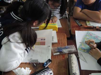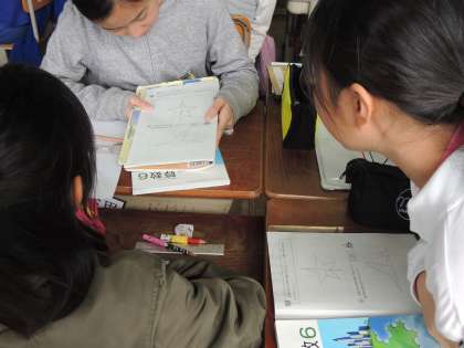 写真の様子は,自分たちで考えたかき方を交流しています。