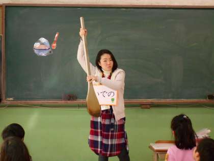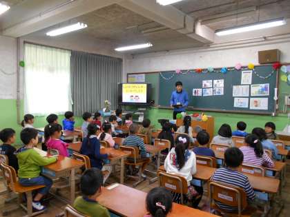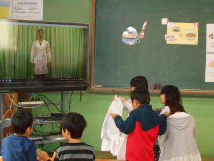 栄養教諭の出野先生が,給食のことを教えに教室に来てくれました。給食室で使う大きなしゃもじを見せてくれたり,給食エプロンのたたみ方を歌に合わせて教えてくれたり,給食が楽しみになりました。