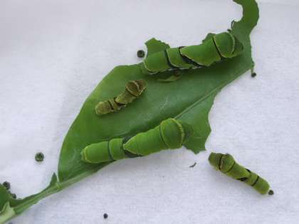 気温が上がるにつれて学校には様々な生き物が出没します。4月の始めに植えたキャベツに産みつけられていたモンシロチョウの卵と、ミカンの木で見つけたナミアゲハの卵を理科室で育てています。餌をもぐもぐ食べて見る見るうちに大きくなりました。