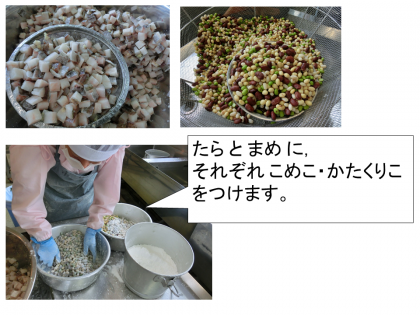 たらと豆のアングレスは,たらと豆にそれぞれ米粉と片栗粉を合わせたものをまぶします。